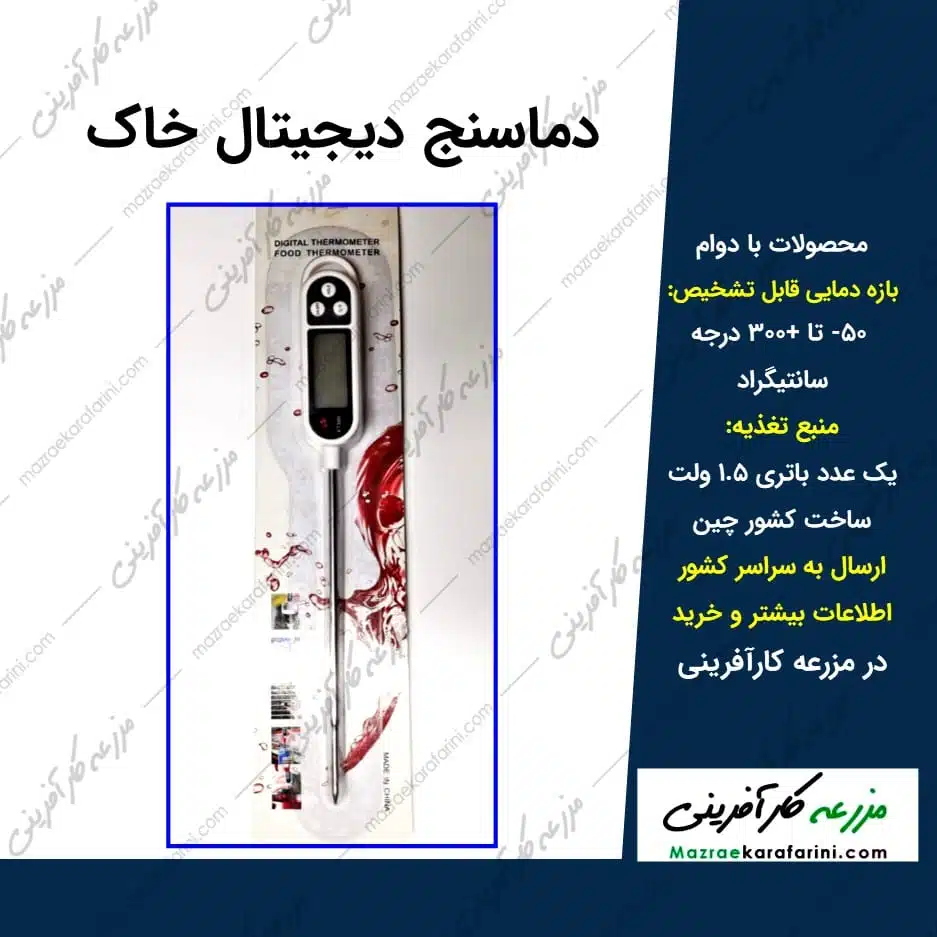 یکی از عوامل مهم در بررسی خاک گلدان ها و گلخانه ها خصوصا در فصول گرم و سرد سال دمای خاک است. مسلما خاک که در بر گیرنده ریشه گیاه است باید چندین فاکتور از جمله دما، رطوبت، ph و … را در حد مطلوب دارا باشد. بنابراین سنجش دوره ای این فاکتورها برای کسانی که کشاورزی مدرن انجام میدهند و یا در منزل گیاهان زینتی پرورش میدهند بسیار مهم است. جهت اندازه گیری دمای خاک میتوانید از ترمومتر دیجیتال یا دماسنج دیجیتال خاک استفاده کنید.