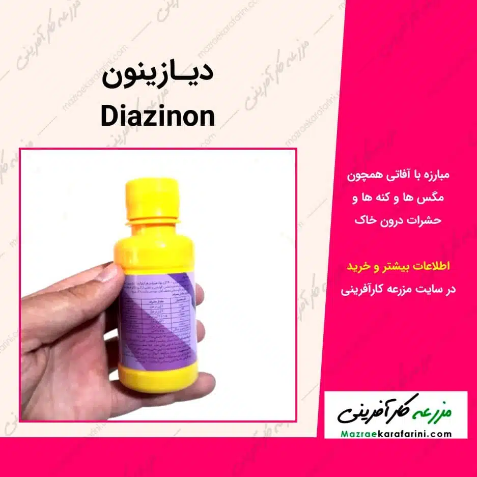 استفاده از دیازینون (Diazinon) با فرمول مولکولی C12H21N2O3PS بعنوان یکی از مرسوم ترین روش های مبارزه با آفاتی همچون مگس ها و کنه ها و حشرات درون خاک است. سم، حشره کش و کنه کش دیازینون در داروخانه گیاهپزشکی مزرعه کارآفرینی در بستهبندیهای متنوع عرضه شده است.